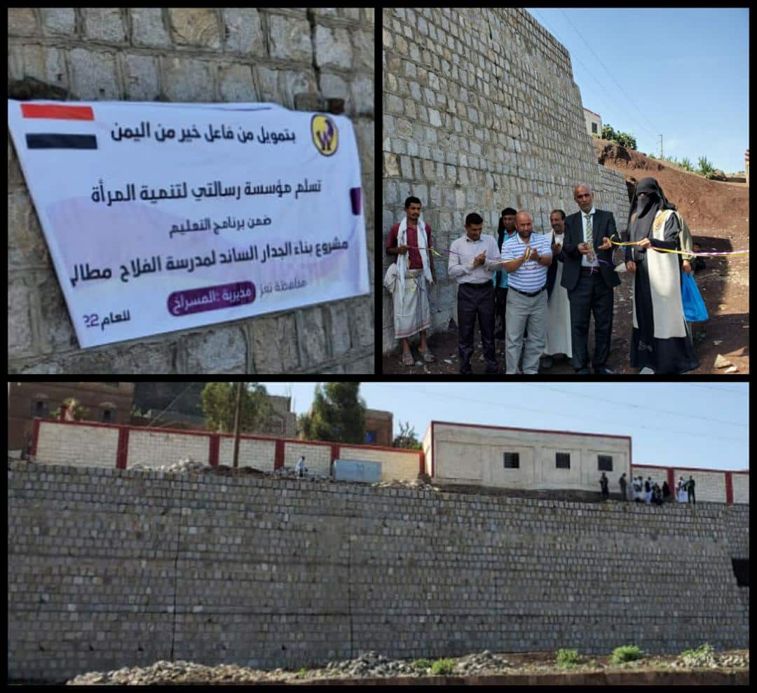 سلمت مؤسسة رسالتي لتنمية المرأة صباح يوم الأثنين الجدار الساند لمدرسة الفلاح مطالي بتمويل من فاعل خير من اليمن وتم الإفتتاح بوجود أ/بلقيس سفيان_رئيس المؤسسة وبحضور رسمي ومجتمعي ل