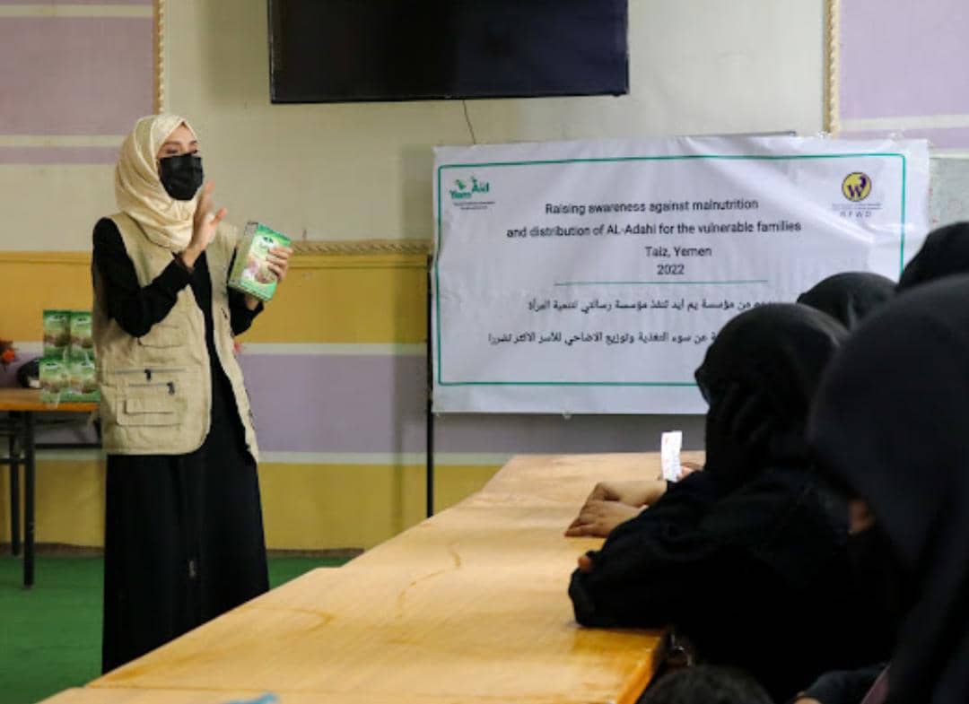 نفذت مؤسسة رسالتي لتنمية المرأة جلسات توعية حول سوء التغذية بدعم من Yem Aid وتم إستهداف 40 إمرأة من الأمهات وتم تقسيمهن لمجموعتين لتنفيذ التوعية مع إخصائية التغذية أ/أسرار السامعي.