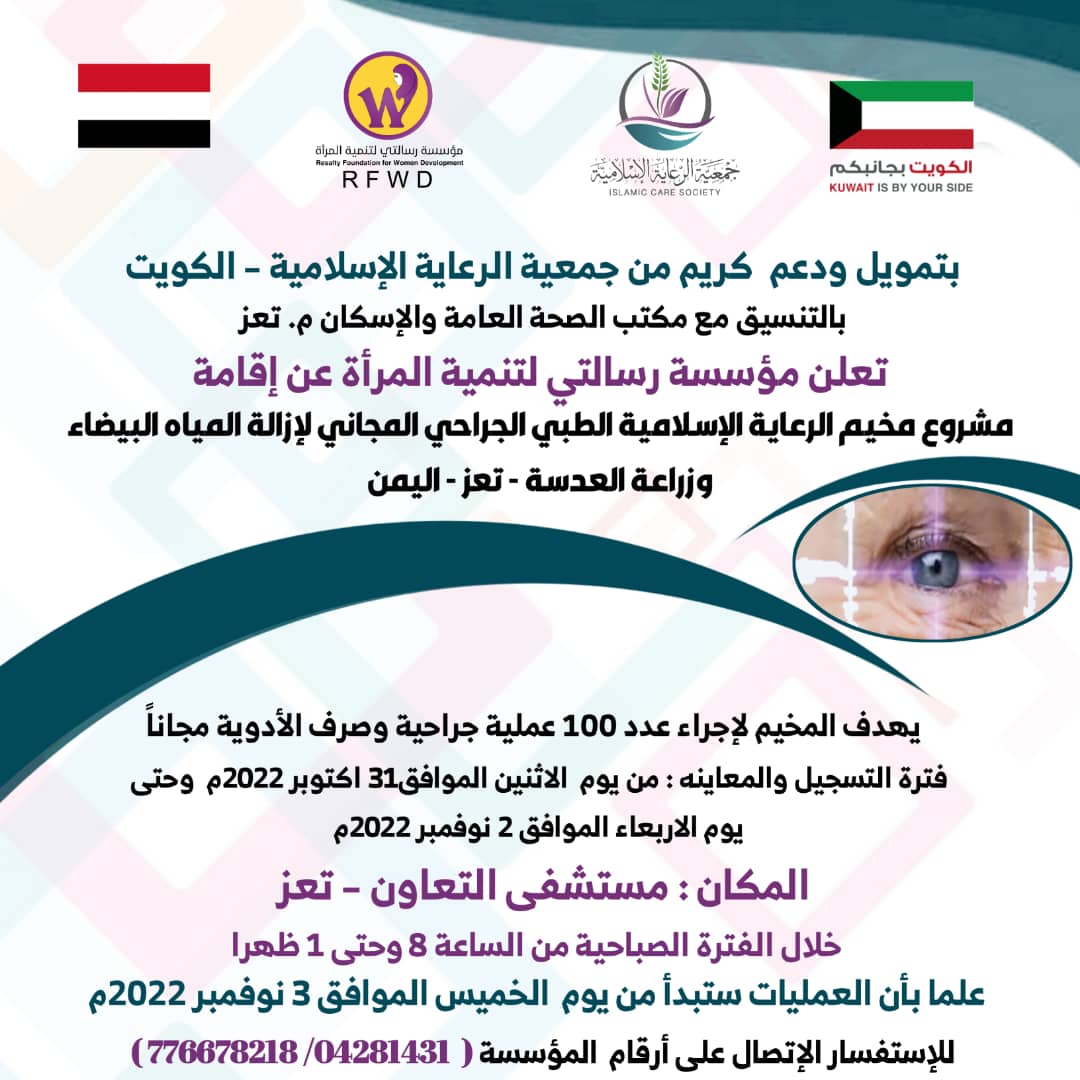 تعلن مؤسسة رسالتي لتنمية المرأة عن إقامة مشروع مخيم الرعاية الإسلامية الطبي الجراحي المجاني لإزالة المياه البيضاء وزراعة العدسة -تعز -اليمن.