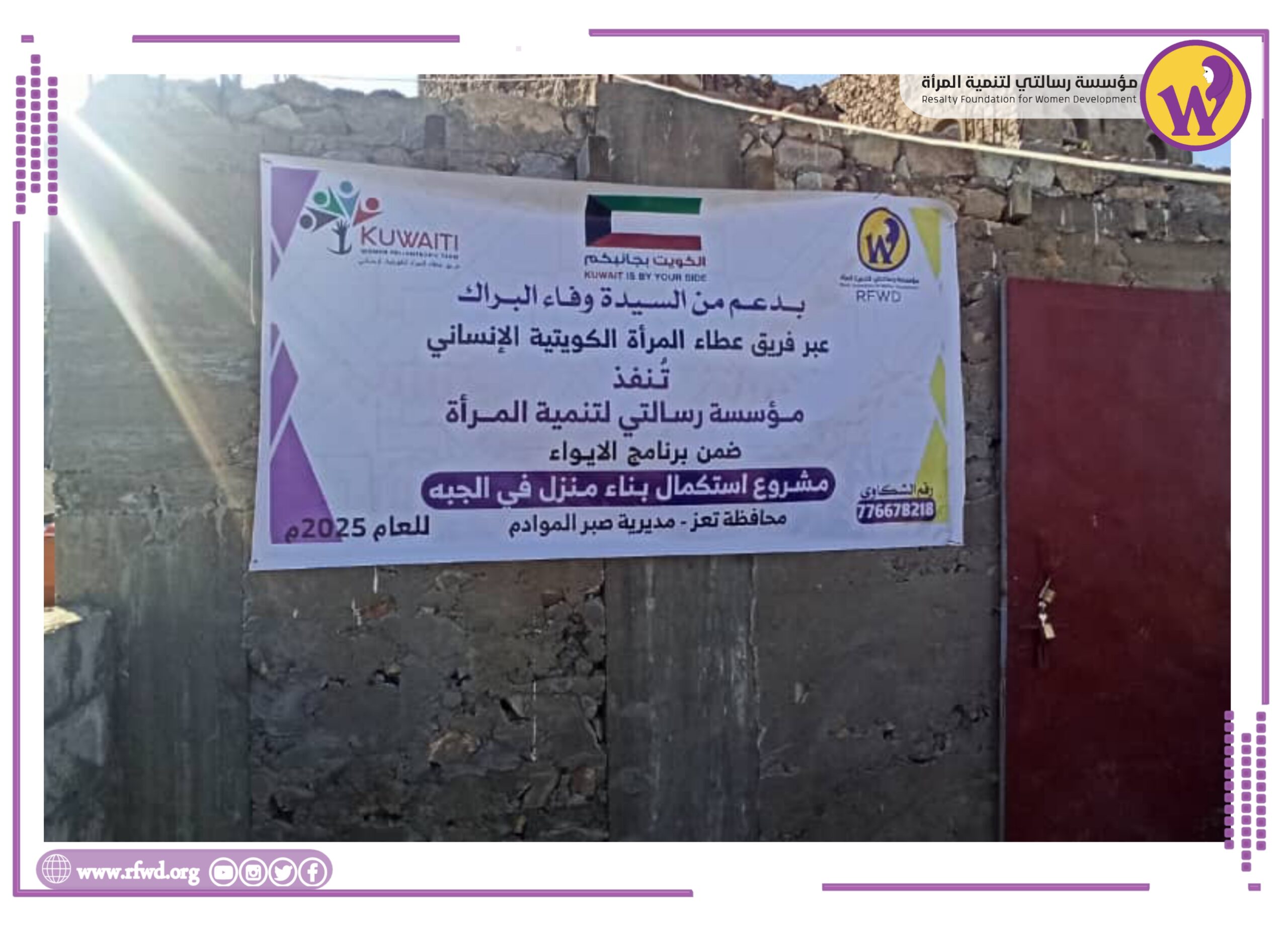 سلمت مؤسسة رسالتي لتنمية المرأة، صباح اليوم ،موقع مشروع استكمال بناء منزل في منطقة الجبه،صبر الموادم، للمقاول عبد الله الحاج والمهندس المشرف أحمد جمال ،بحضور مدير مديرية صبر الموادم جمال النقيب، إيذانا ببدء أعمال البناء، وذلك بدعم كريم من السيدة وفاء البراك عبر فريق عطاء المرأة الكويتية الإنساني، ضمن برنامج الإيواء الذي تنفذه المؤسسة.